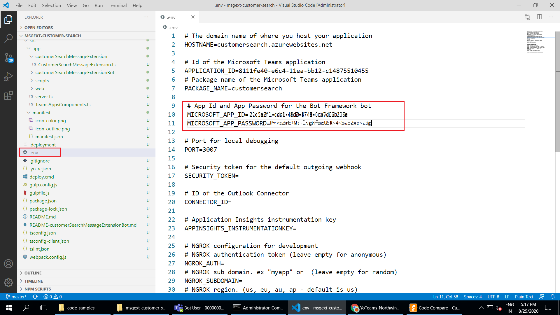 In the .env file, configure application ID and client secret from Bot channels registration.