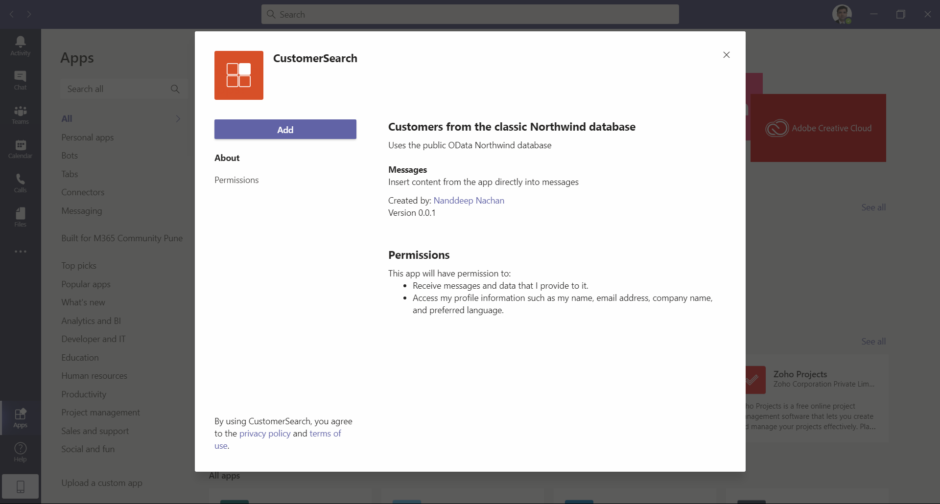 The code developed during this article can be found at: https://github.com/nanddeepn/code-samples/tree/master/MSTeams/yo-teams/msgext-customer-search