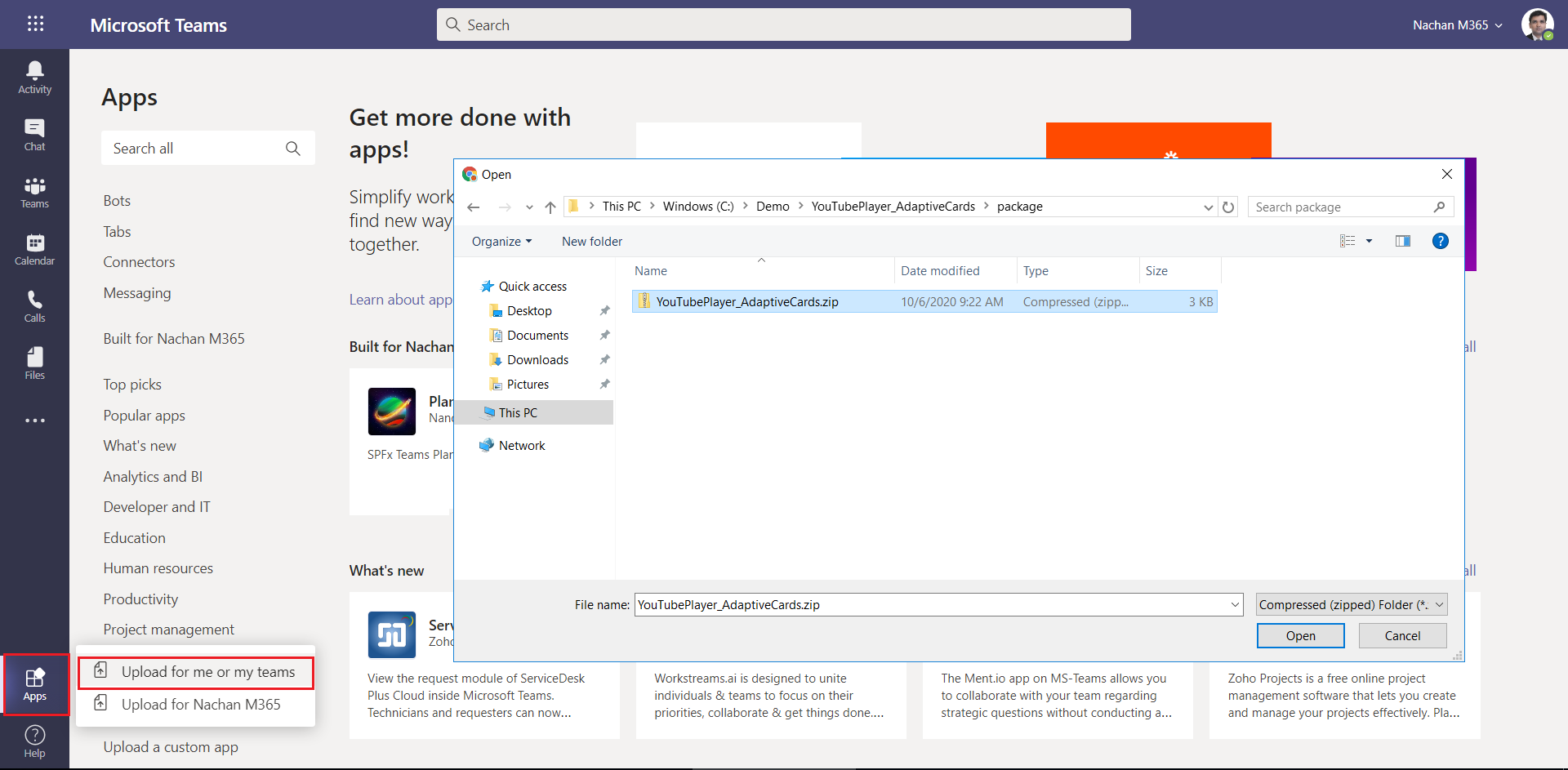- Select Upload a custom app > Upload for me or my teams.
