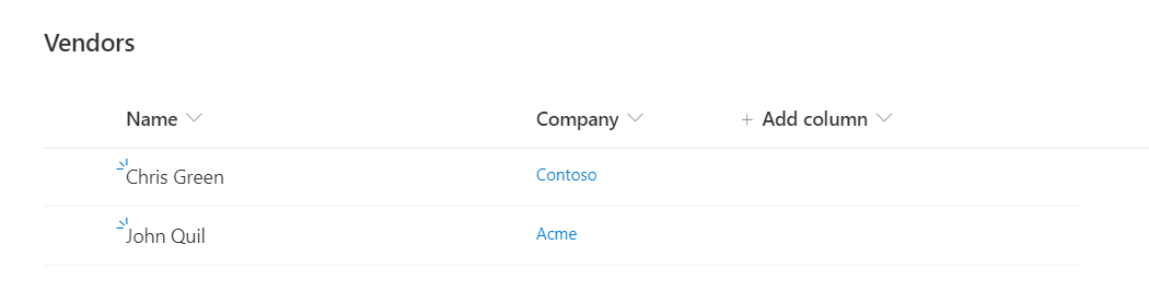A list to store vendor information, which will have a lookup column (Company) to the above list.