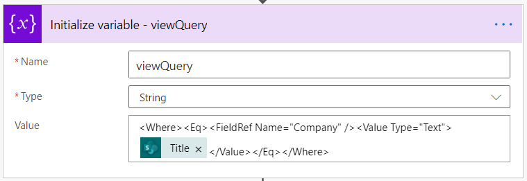 <Where><Eq><FieldRef Name="Company" /><Value Type="Text">@{triggerOutputs()?['body/Title']}</Value></Eq></Where>