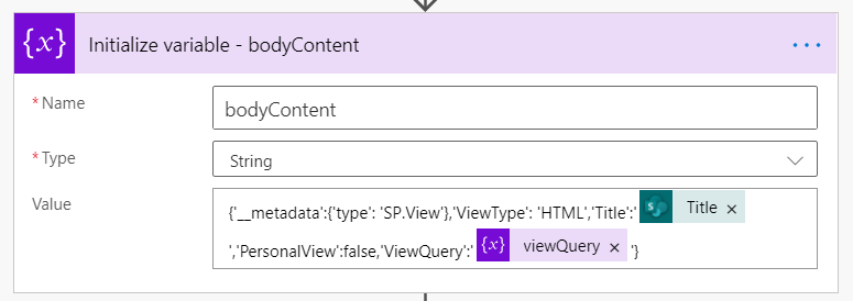 {'__metadata':{'type': 'SP.View'},'ViewType': 'HTML','Title':'@{triggerOutputs()?['body/Title']}','PersonalView':false,'ViewQuery':'@{variables('viewQuery')}'}