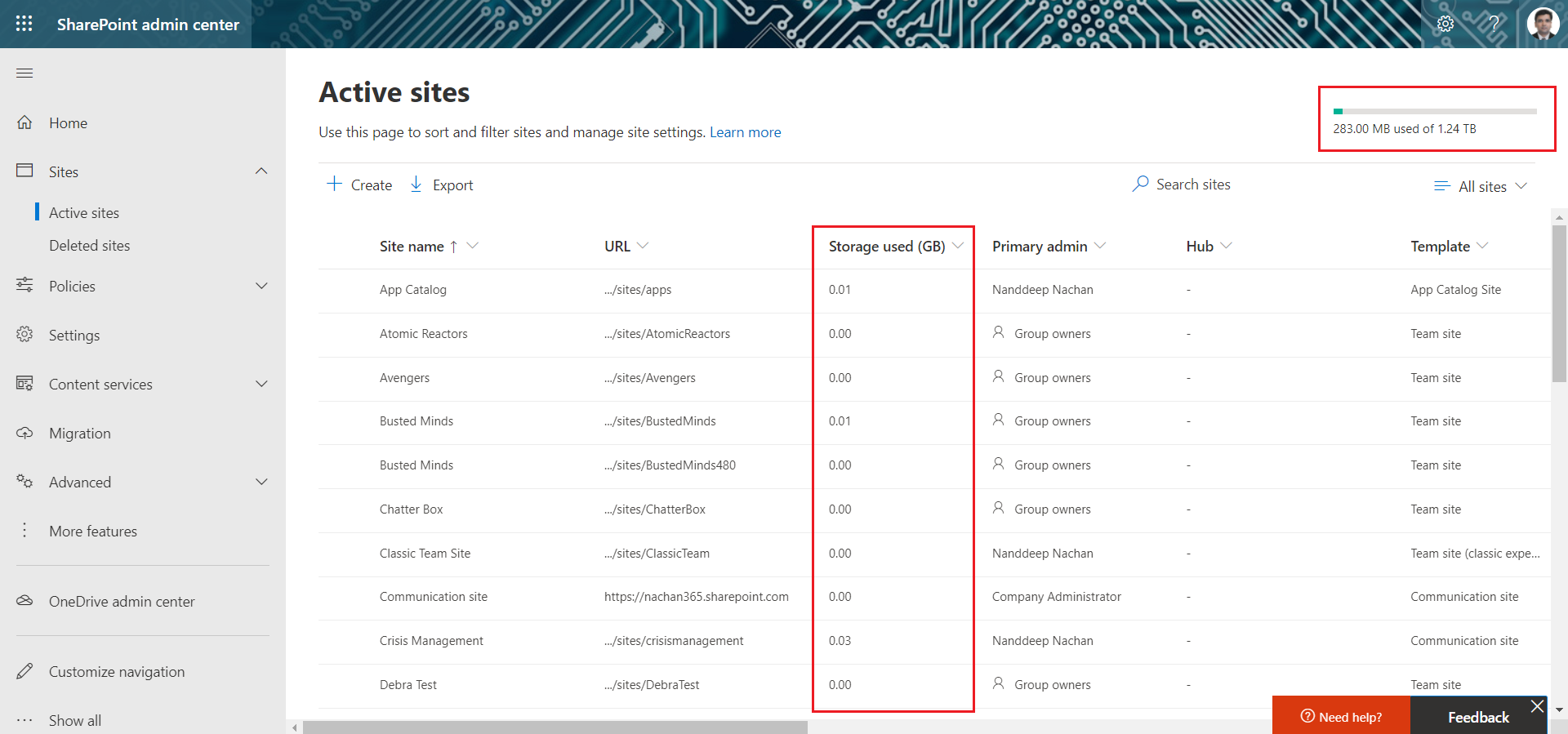 The Active sites page in the SharePoint Online admin center though shows the storage used for each site. Also, we can see the total storage used and available for use.