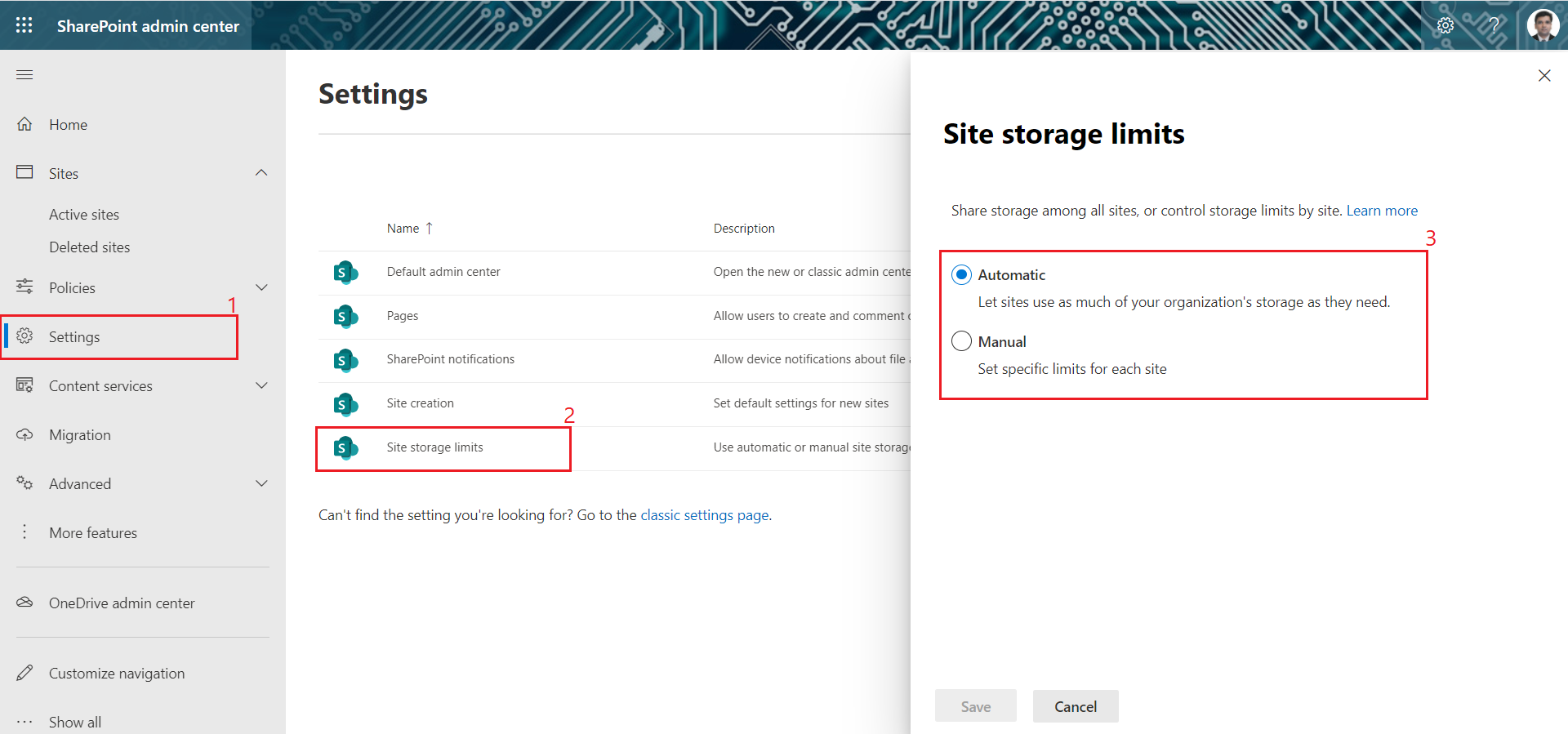 - Automatic: The default. All sites get the storage from a central pool. The global or SharePoint administrator does not have to manage the storage per site. It is handled automatically by SharePoint for them.