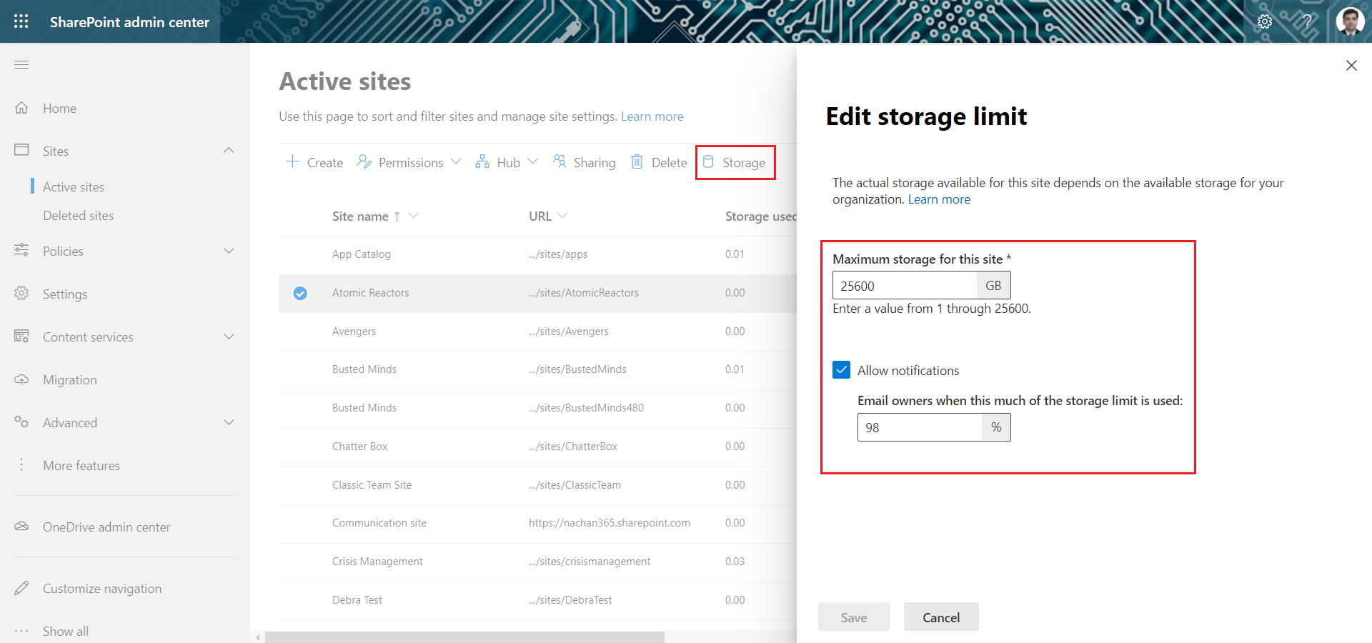 With the manual option, the administrator can configure the maximum storage per site and can also set the notification for site owners when a certain percentage of the site storage limit is consumed.