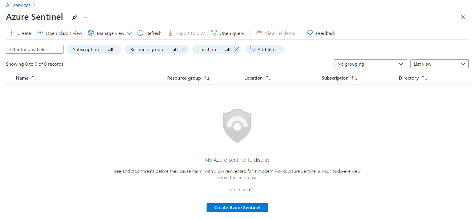 On the Azure Sentinel page, click Create Azure Sentinel.