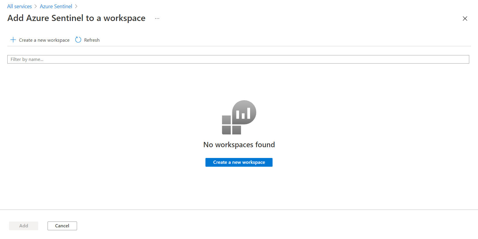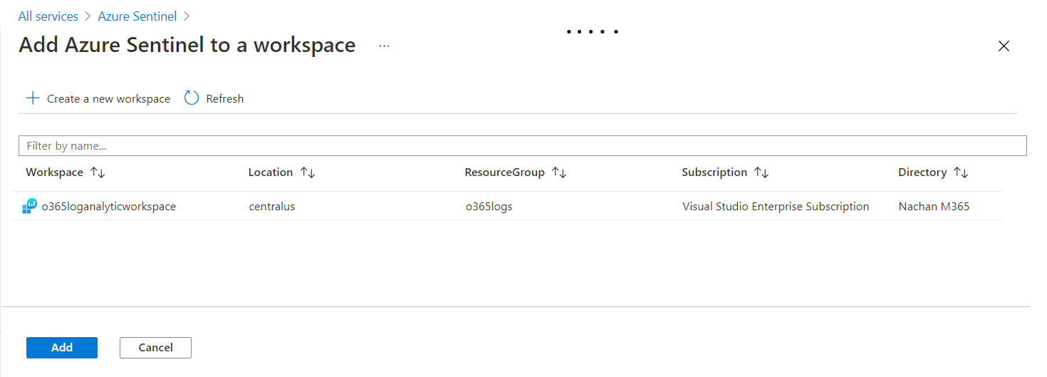 Add Azure Sentinel to a workspace by clicking Add.