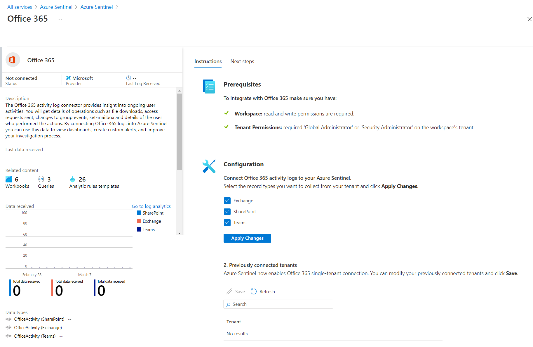 - Azure Sentinel now enables Office 365 single-tenant connection. Under Configuration, select the record types you want to collect from your tenant.