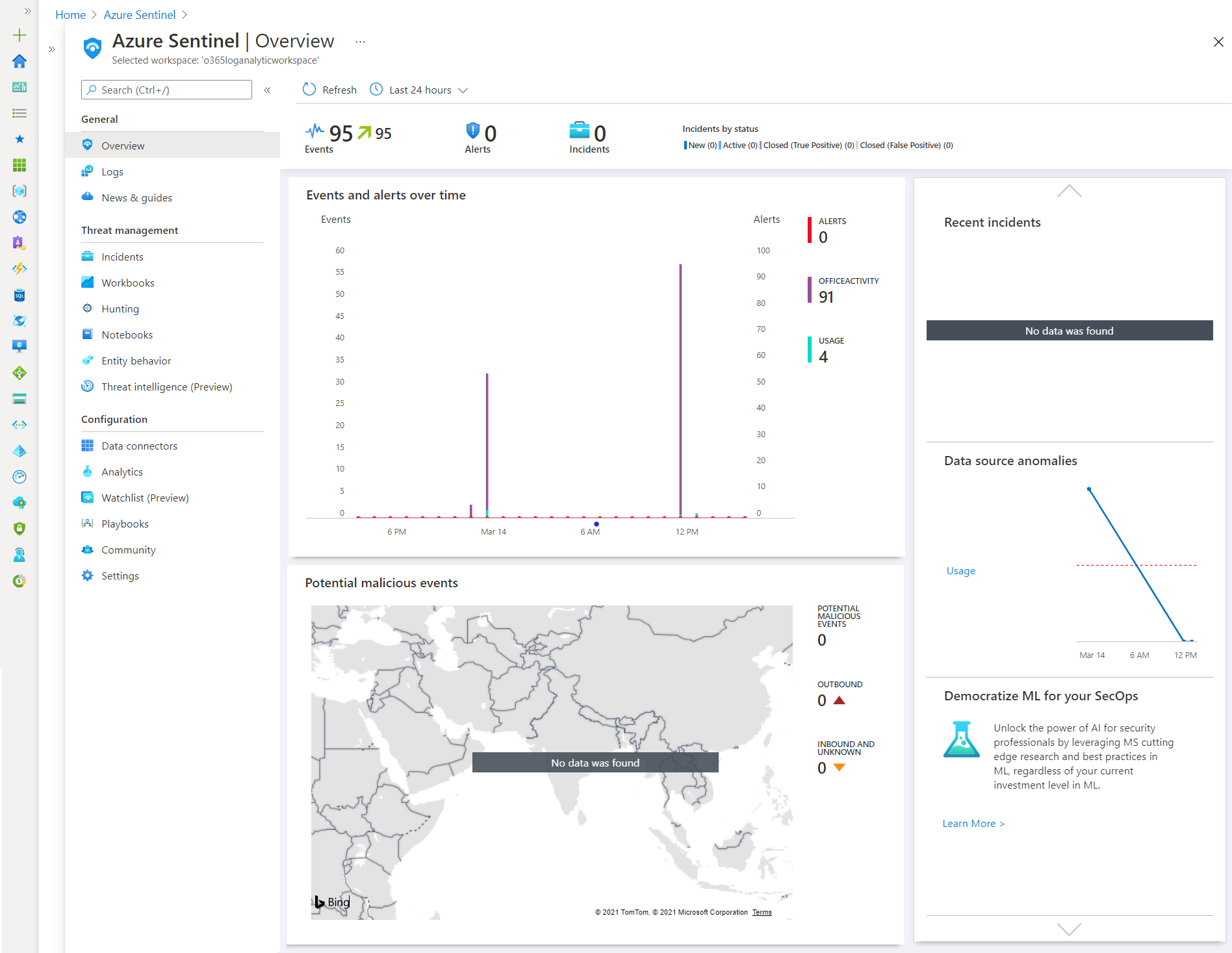 Once Azure Sentinel is connected to Log Analytics Workspace, it looks like below: