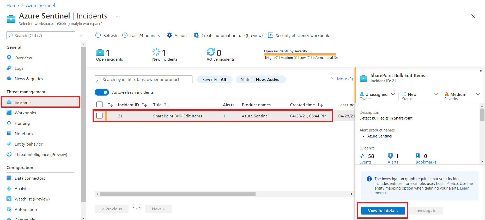 - In Azure Sentinel, under Threat Management, click Incidents.