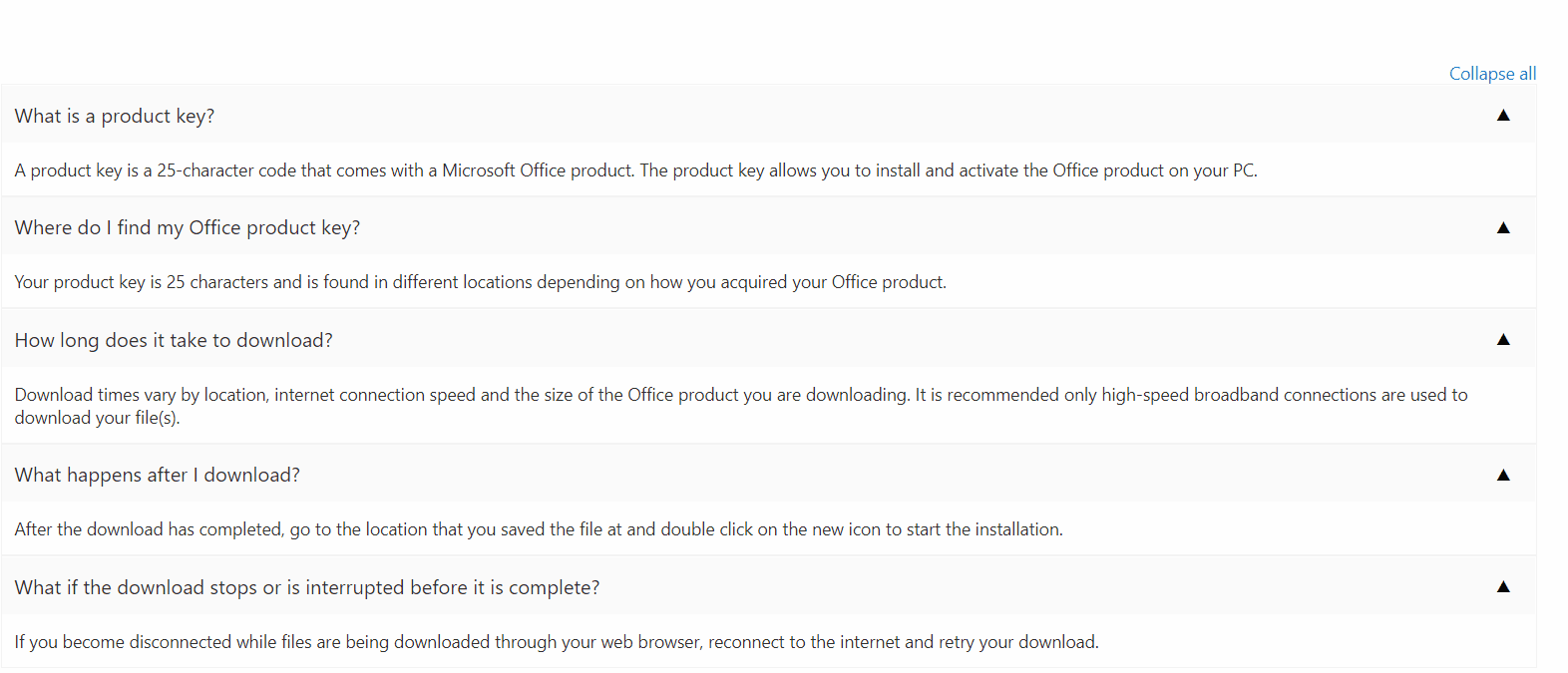 { title: "How long does it take to download?", description: "Download times vary by location, internet connection speed and the size of the Office product you are downloading. It is recommended only high-speed broadband connections are used to download your file(s)." },