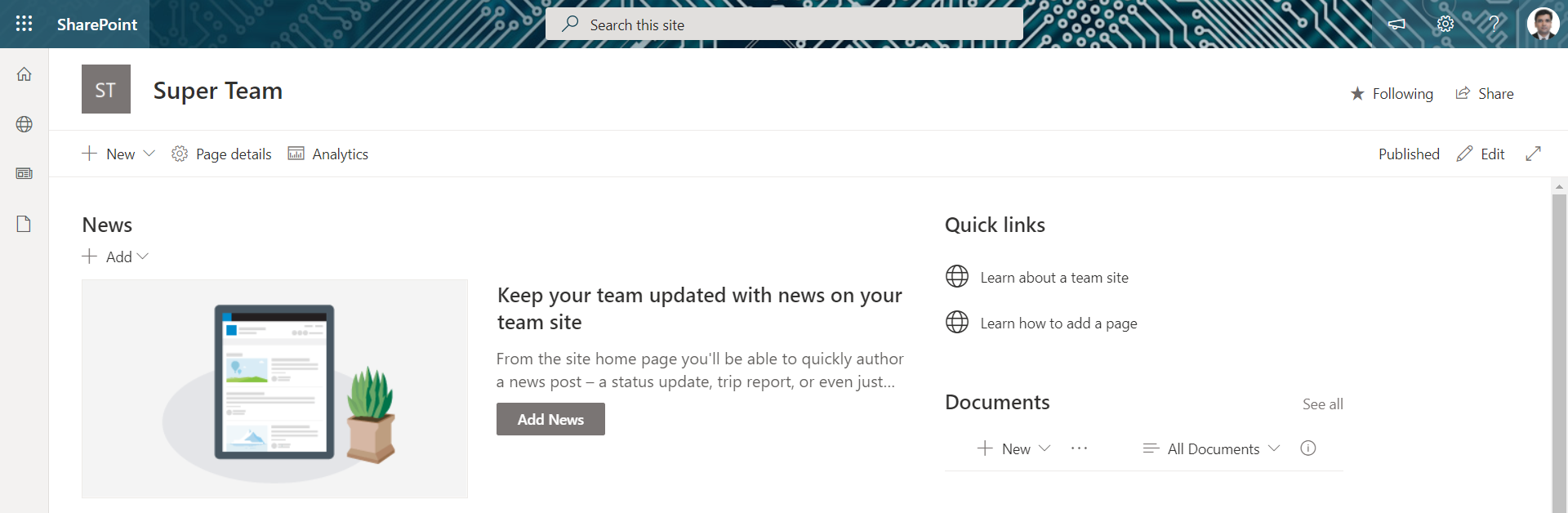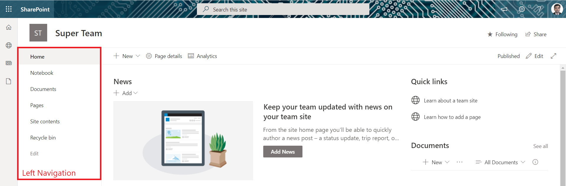 Modern SharePoint Team site (Group connected as well non-Group created) by default shows a left navigation with pre-configured links, as well we can add our own customized links.
