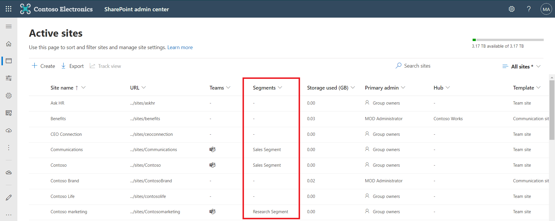 On the Active Sites tab in SharePoint admin center, the Segments column displays the first segment associated with the site.