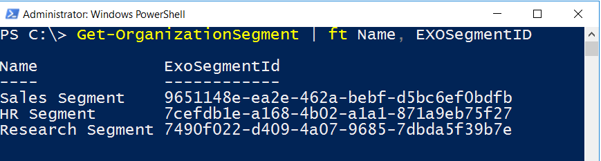 Get-OrganizationSegment | ft Name, EXOSegmentID