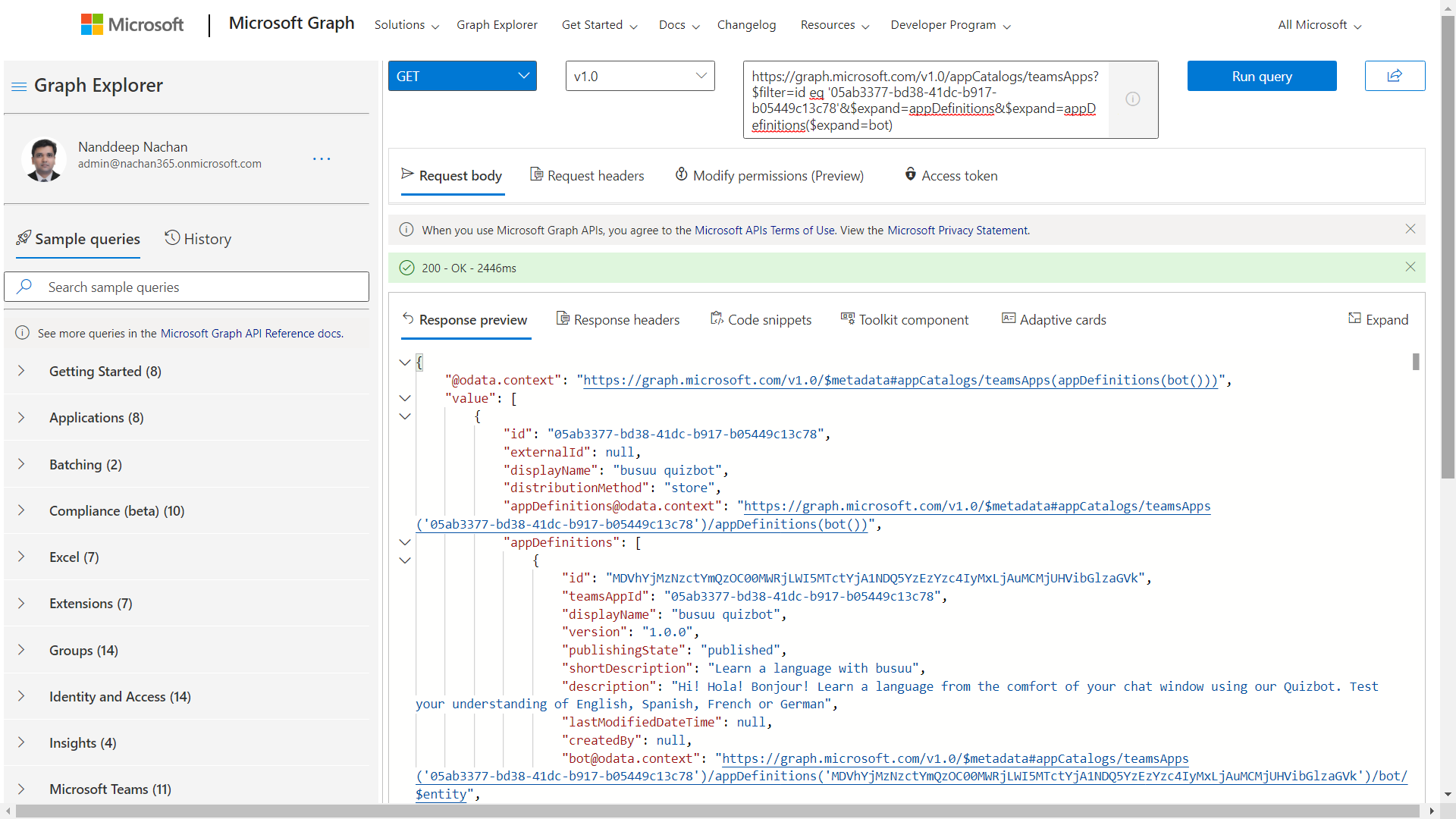 https://graph.microsoft.com/v1.0/appCatalogs/teamsApps?$filter=id eq '05ab3377-bd38-41dc-b917-b05449c13c78'&$expand=appDefinitions&$expand=appDefinitions($expand=bot)