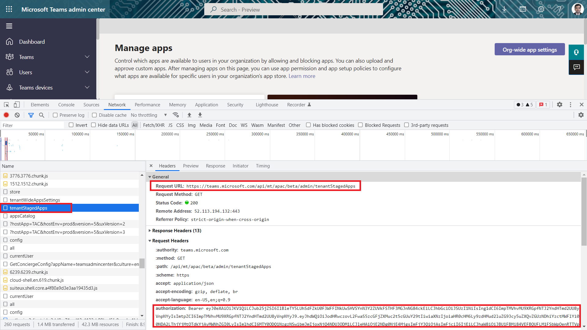 - There is an interesting API being called https://teams.microsoft.com/api/mt/apac/beta/admin/tenantStagedApps, which gives app details in one call.