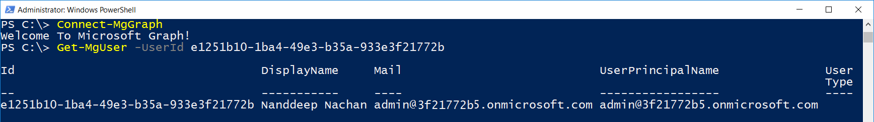 Get-MgUser -UserId e1251b10-1ba4-49e3-b35a-933e3f21772b