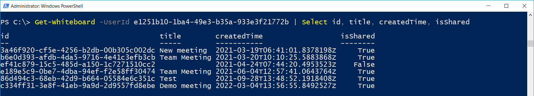 $whiteboardInfo = Get-Whiteboard -UserId $whiteboardOwner.OwnerID