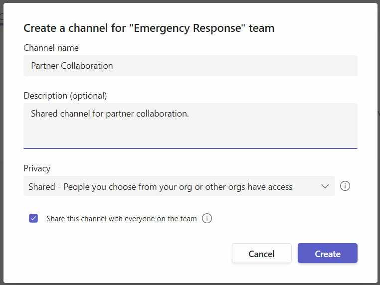In the Microsoft Teams team, choose to create a new channel by selecting privacy as the shared channel.