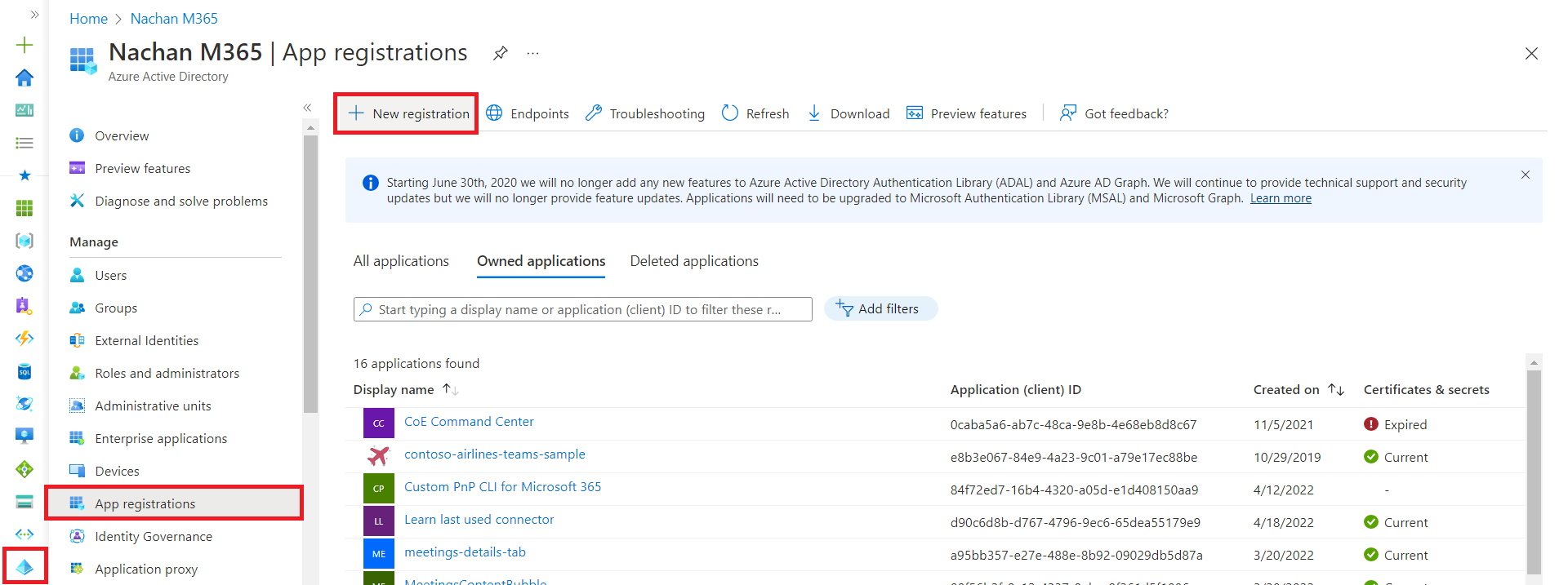 - From the left menu, click App registrations.