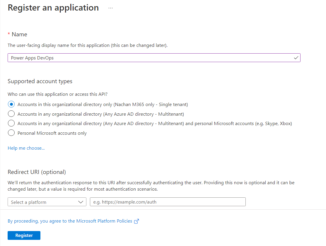 Create a new app registration as follows:
