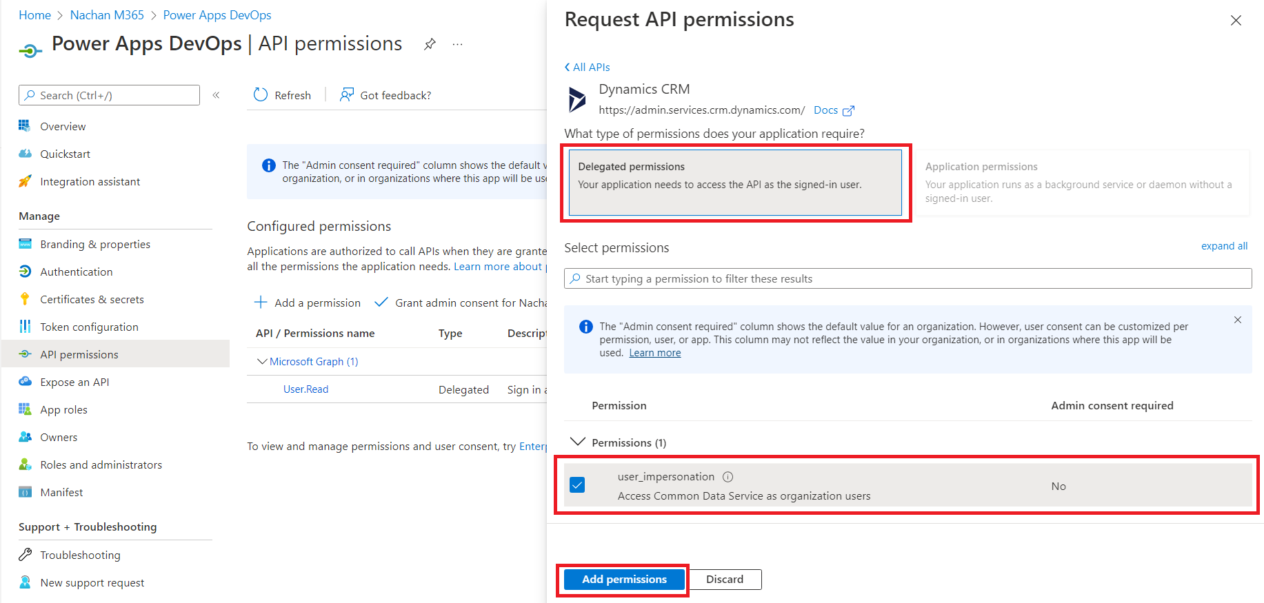 Select the delegated permissions and Add permissions.
