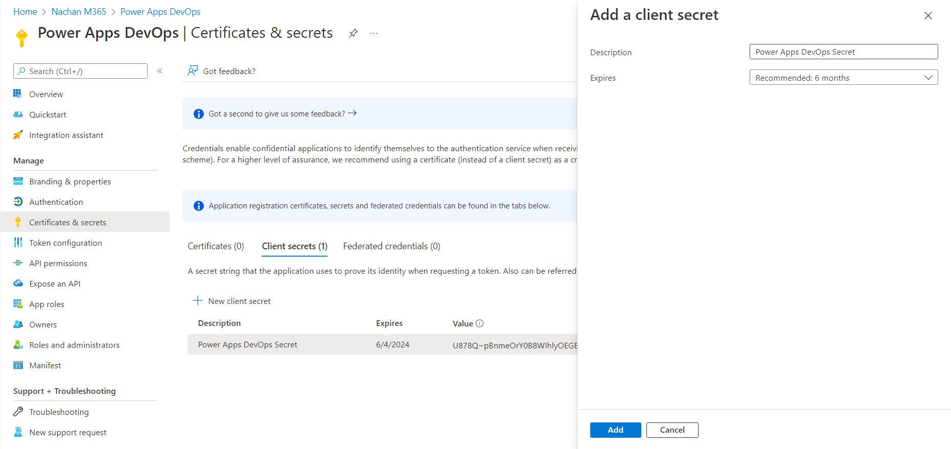 - From left menu, click Certificates & secrets