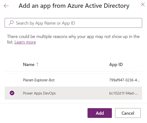 Select the previously created Azure AD app from the list.