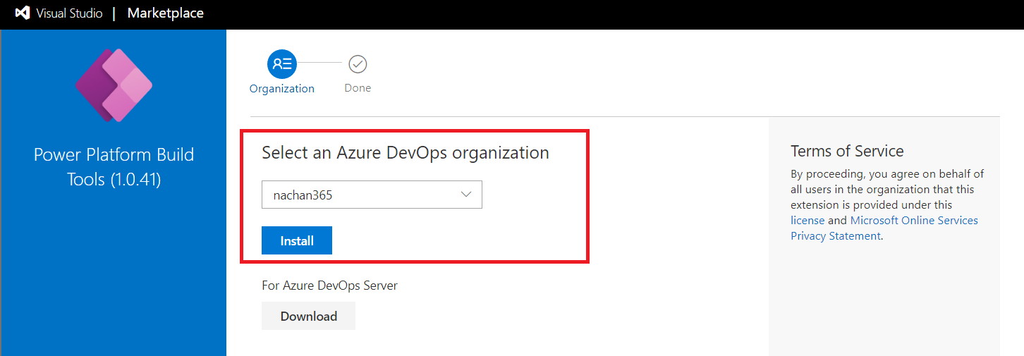 - Select your Azure DevOps organization.