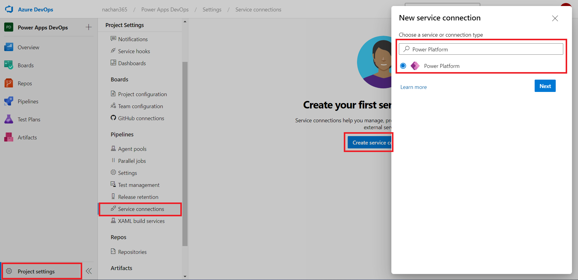 - Select Service connection.