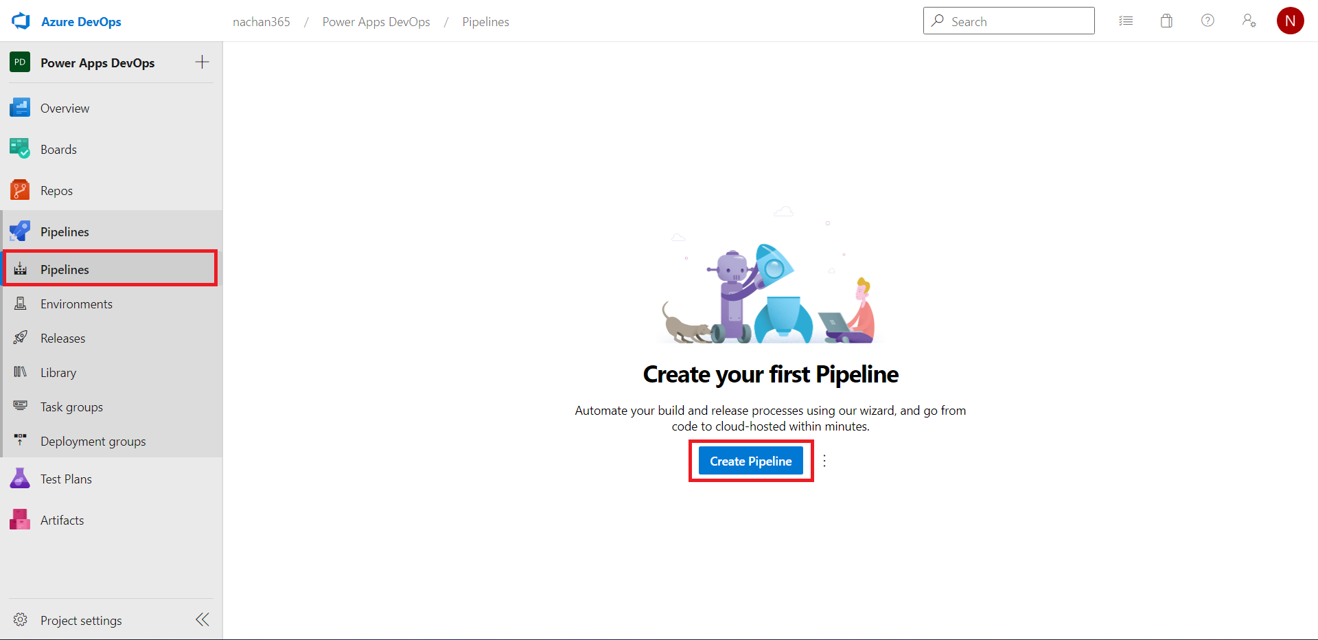 - In the Azure DevOps project, click Pipelines.