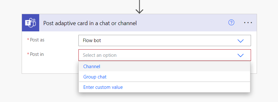 In the simplest form, the Power Automate action named Post adaptive card in a chat or channel can be used to send an adaptive card on MS Teams to Channel or an existing Group chat.