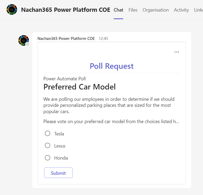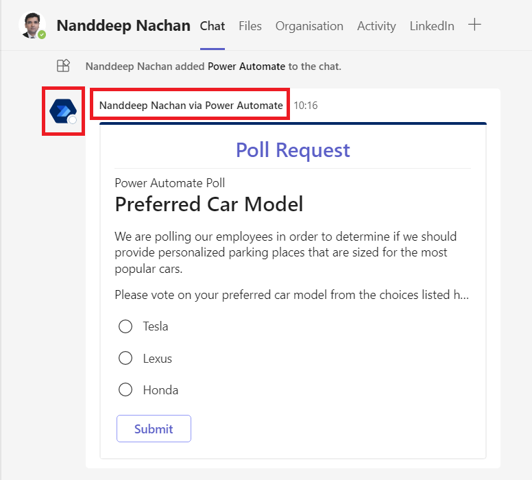 Power Automate’s Post adaptive card in a chat or channel action is very handy for presenting information better to the users with Adaptive cards. It lacks the functionality to send the Adaptive cards as a 1:1 message. The combination of actions demonstrated in this article should help you overcome the limitation and make the message appear from a trusted source within the organization.