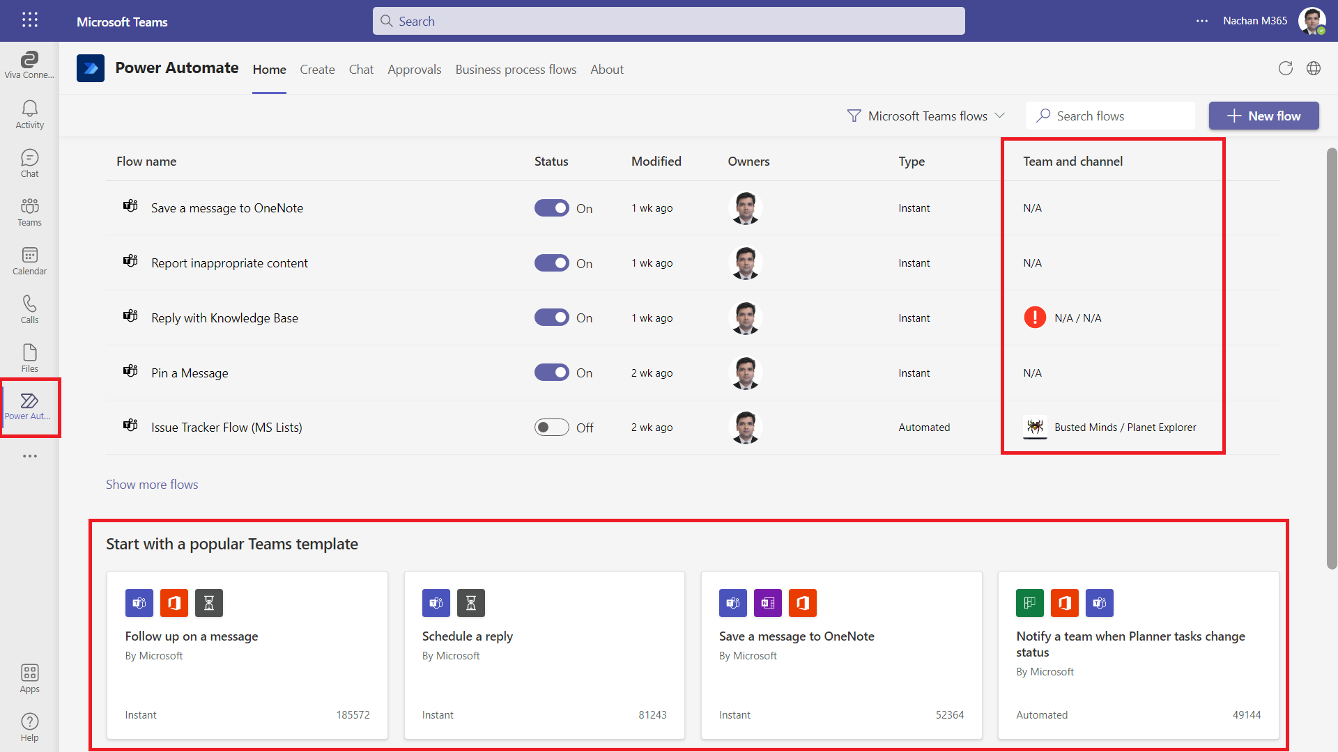 The default view shows the basic information on the created flows. The column “Team and Channel” is tricky to read. It lists out the Teams and Channels your flow reads/writes to/from.