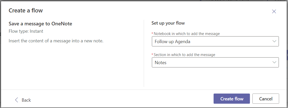 - Then we need to select Notebook as well as the section within that Notebook where we need to store the message and then just click on create flow and That’s it.