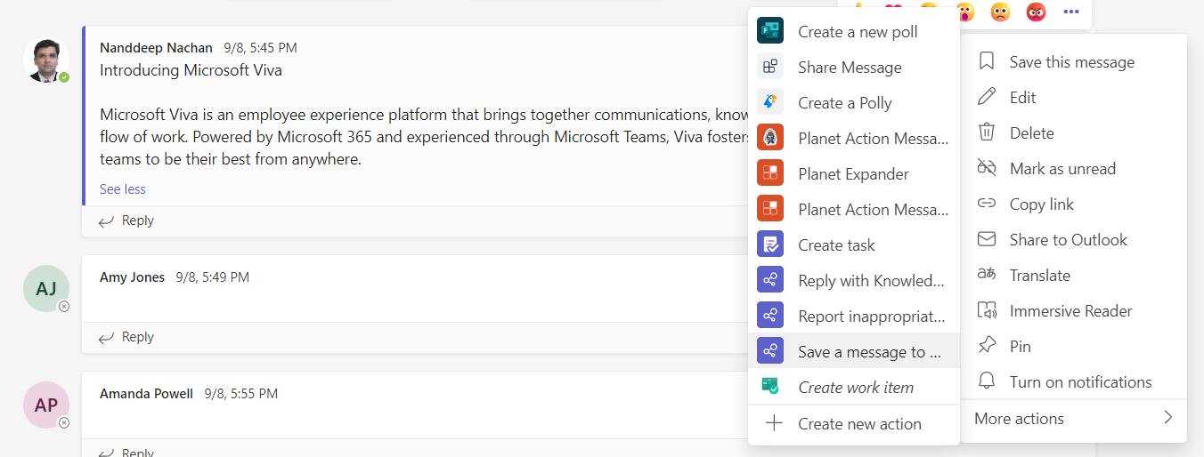 Let us head to any existing message in Teams. Under More actions , you will see all the messaging extensions listed.
