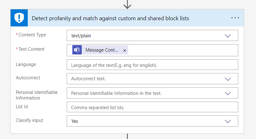 The next action from the Content Moderator connector helps to detect profanity, by passing in the selected message content.