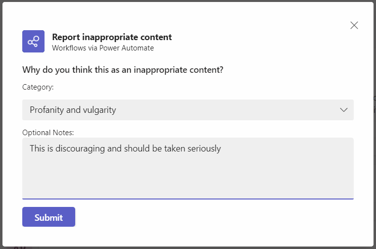 The below adaptive card allows users to select a category and add optional notes while reporting profanity.