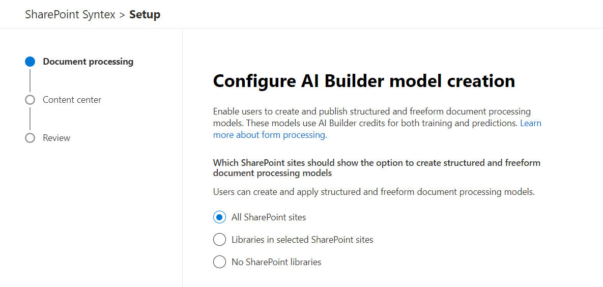 Under Configure AI Builder model creation, choose any of below option to create structured and freeform document processing models on SharePoint sites.