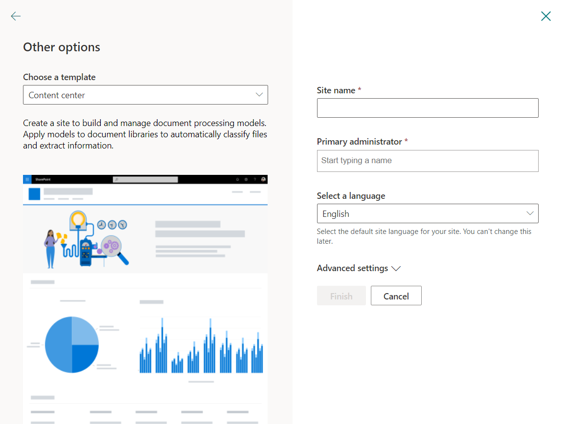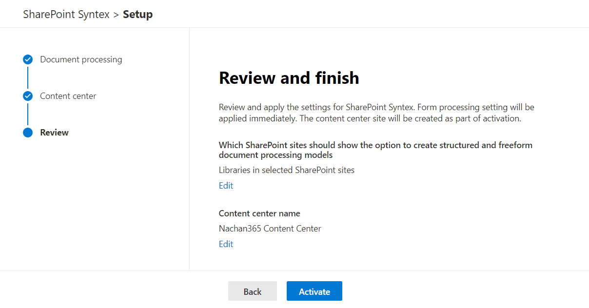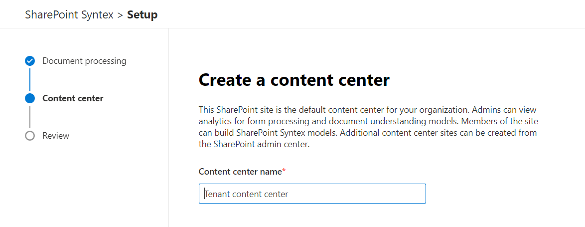 Specify the Content center name. SharePoint site will be created with the specified name as a default content center.