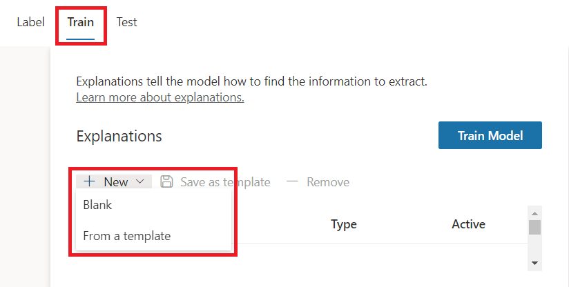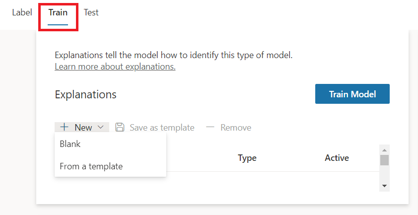 Using explanation, we can provide hint about the entity format. On the Train tab, click New to create the explanation.