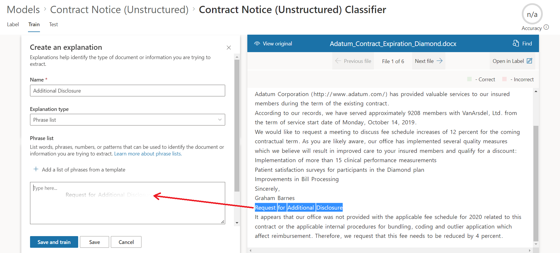 Click Save and train to see if the explanation is enough to identify positive and negative documents.