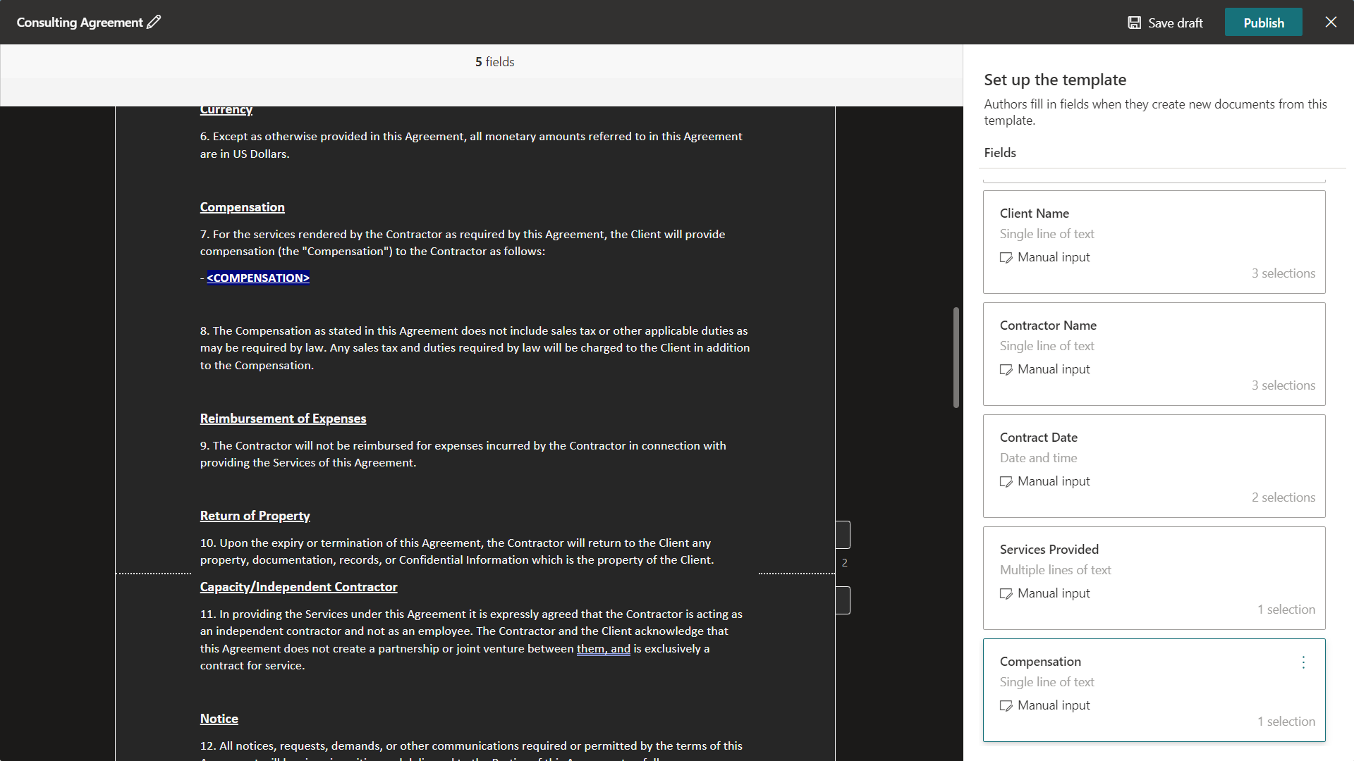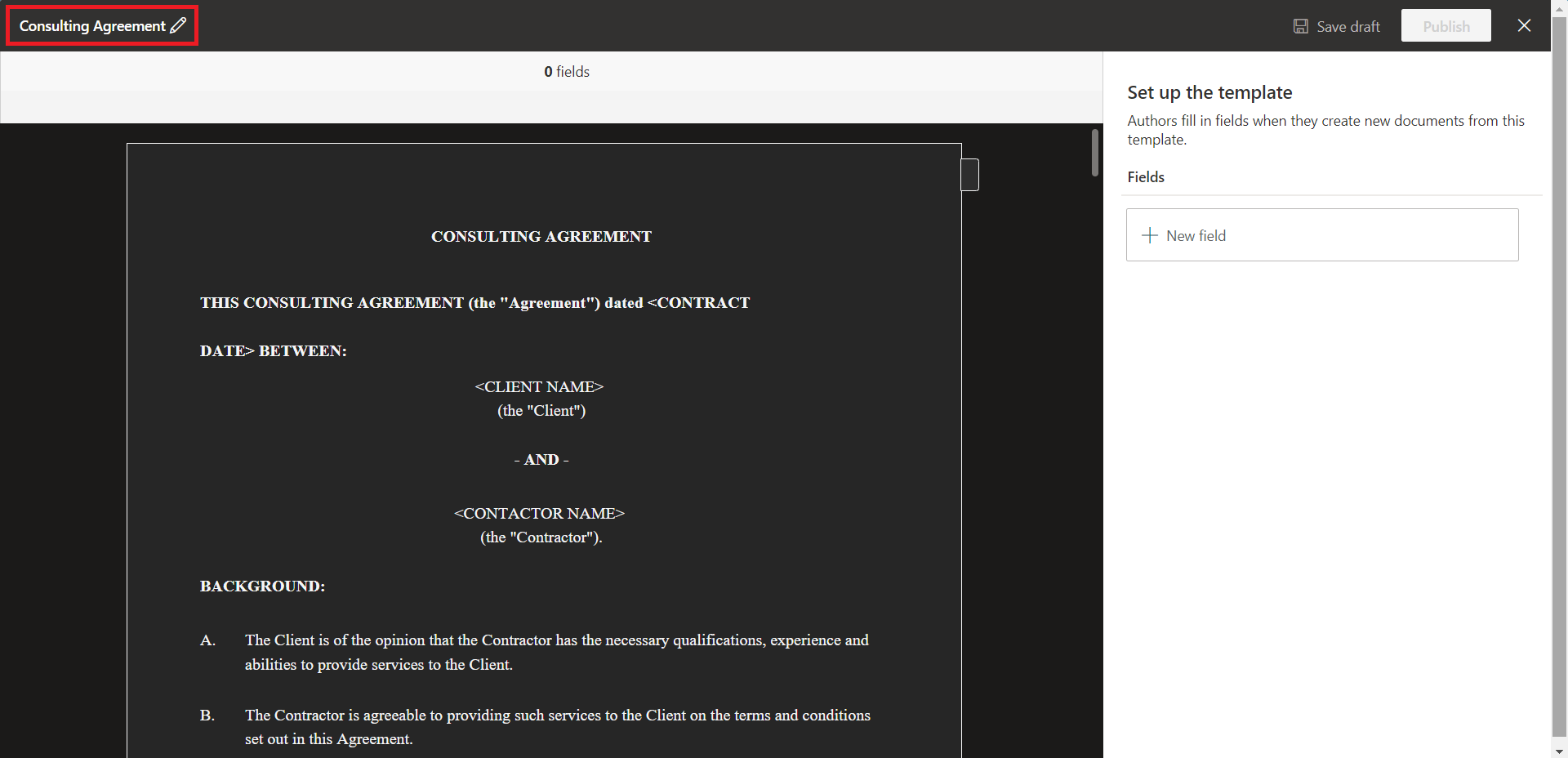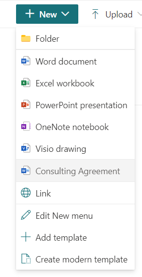 Click Publish to make the modern template available for everyone to create documents based on it. The modern template (Consulting Agreement) should be now visible under the New menu.