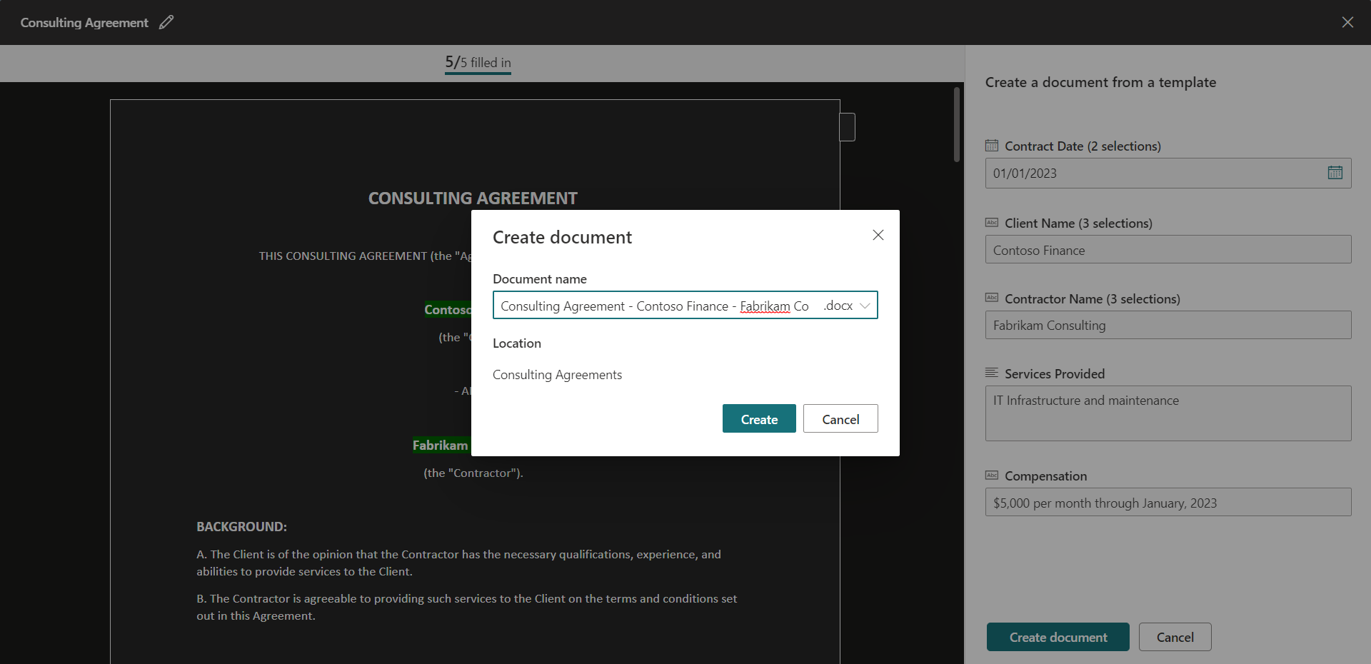 The consulting agreement needs to be renewed for each vendor every year. Contoso spends a significant amount of time generating Consulting agreements which is time-consuming and error-prone work. Contoso is looking for automating this work.