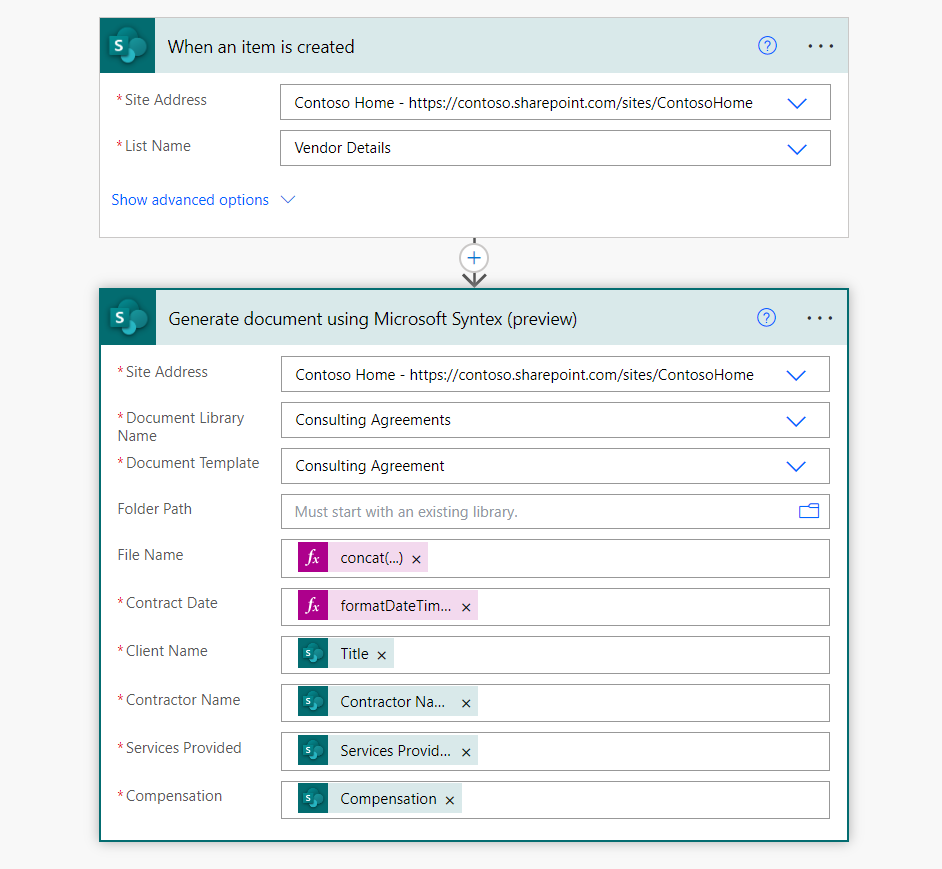 Let us consider a business case, where Contoso maintains the vendors’ renewal information in a SharePoint list. When there will be a time to renew the contract with the vendor, the concerned Contoso department will add an item to the SharePoint list. This action will be picked by Power Automate flow to generate the contract renewal document based on the information provided.