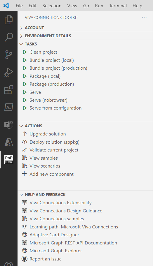 Once you create a project or open an existing project, the Viva Connections Toolkit extension provides you with various tasks and actions to ease the job of the developer to bundle, package, and serve the solution.