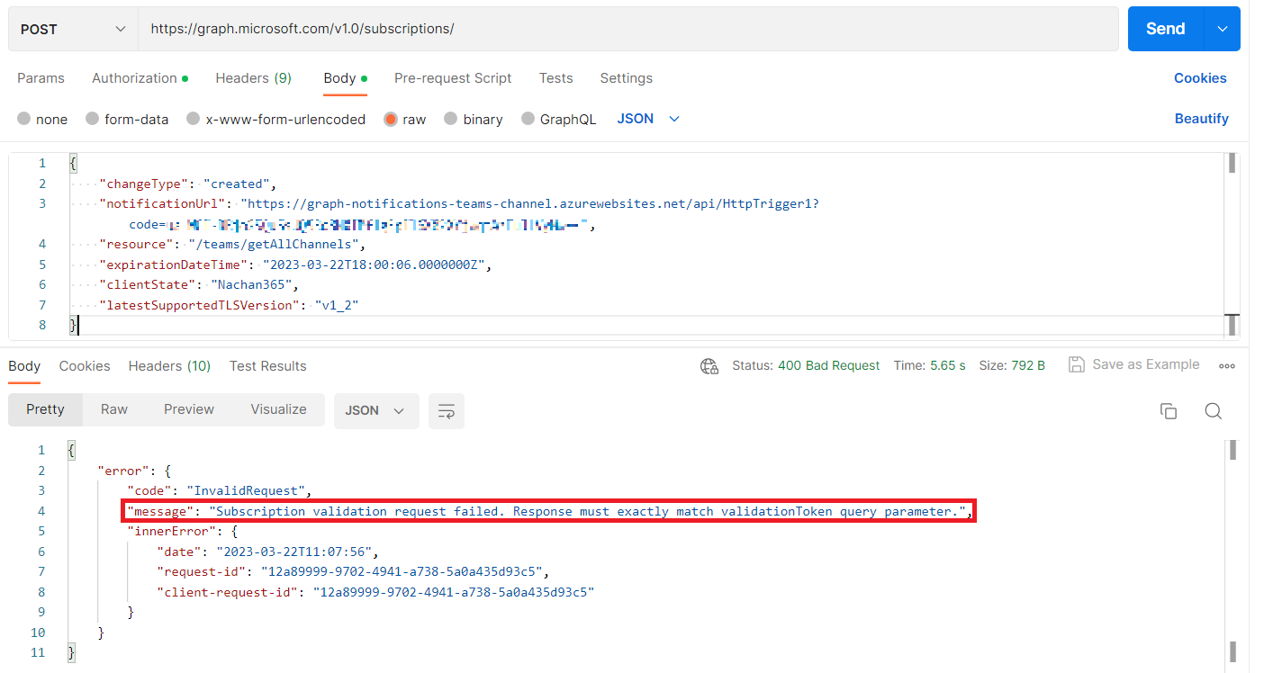 The notificationUrl (i.e., Azure function - we will create in next step) must be capable of responding to the validation request as mentioned here.