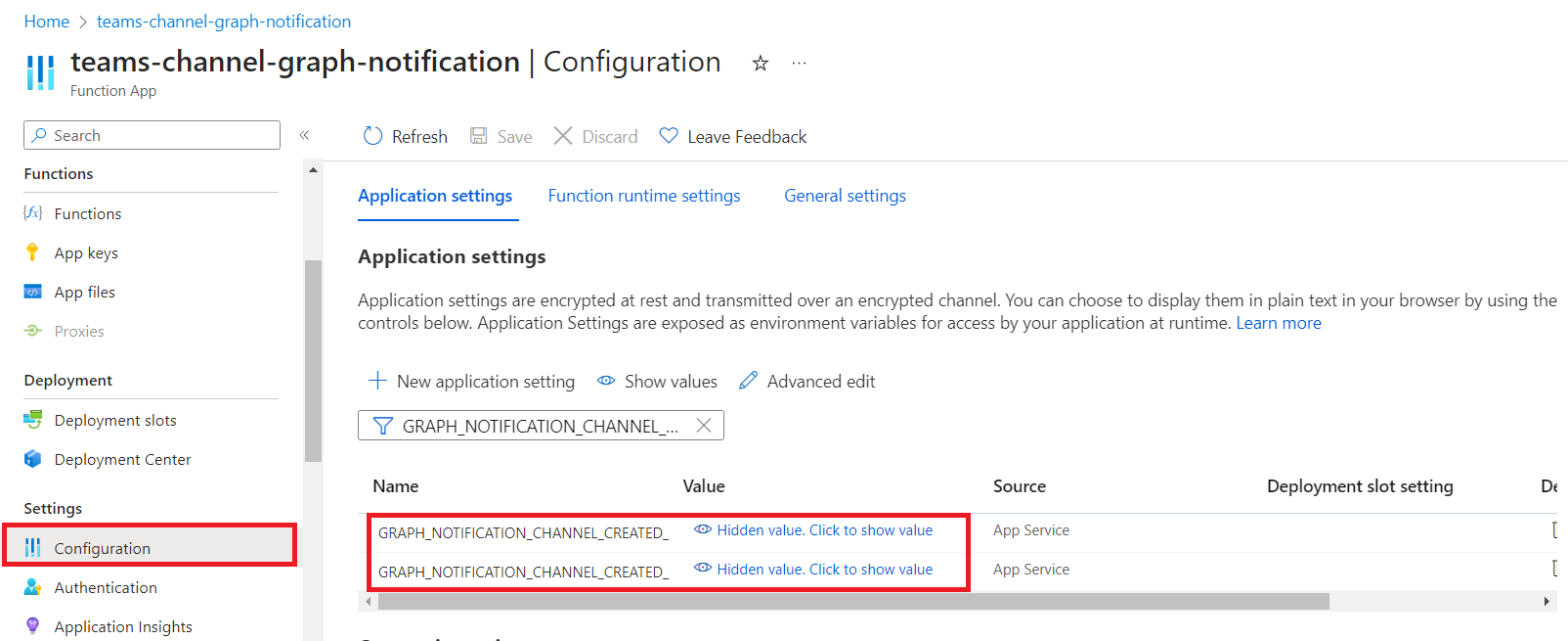 Note down the Id and clientState and update them to the Azure Function Application settings as follows: