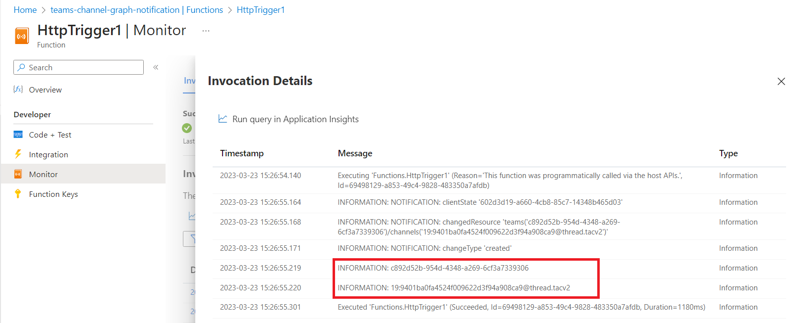 Create a new channel in any Teams team in the tenant. Watch the output from the http trigger. You should see the TeamID and ChannelID of the newly created channel.
