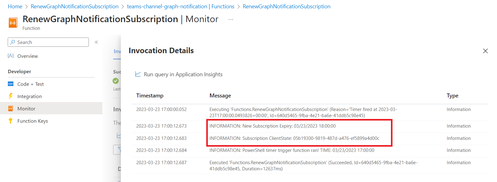 The Graph notification subscription will be renewed by Azure function with timer trigger.